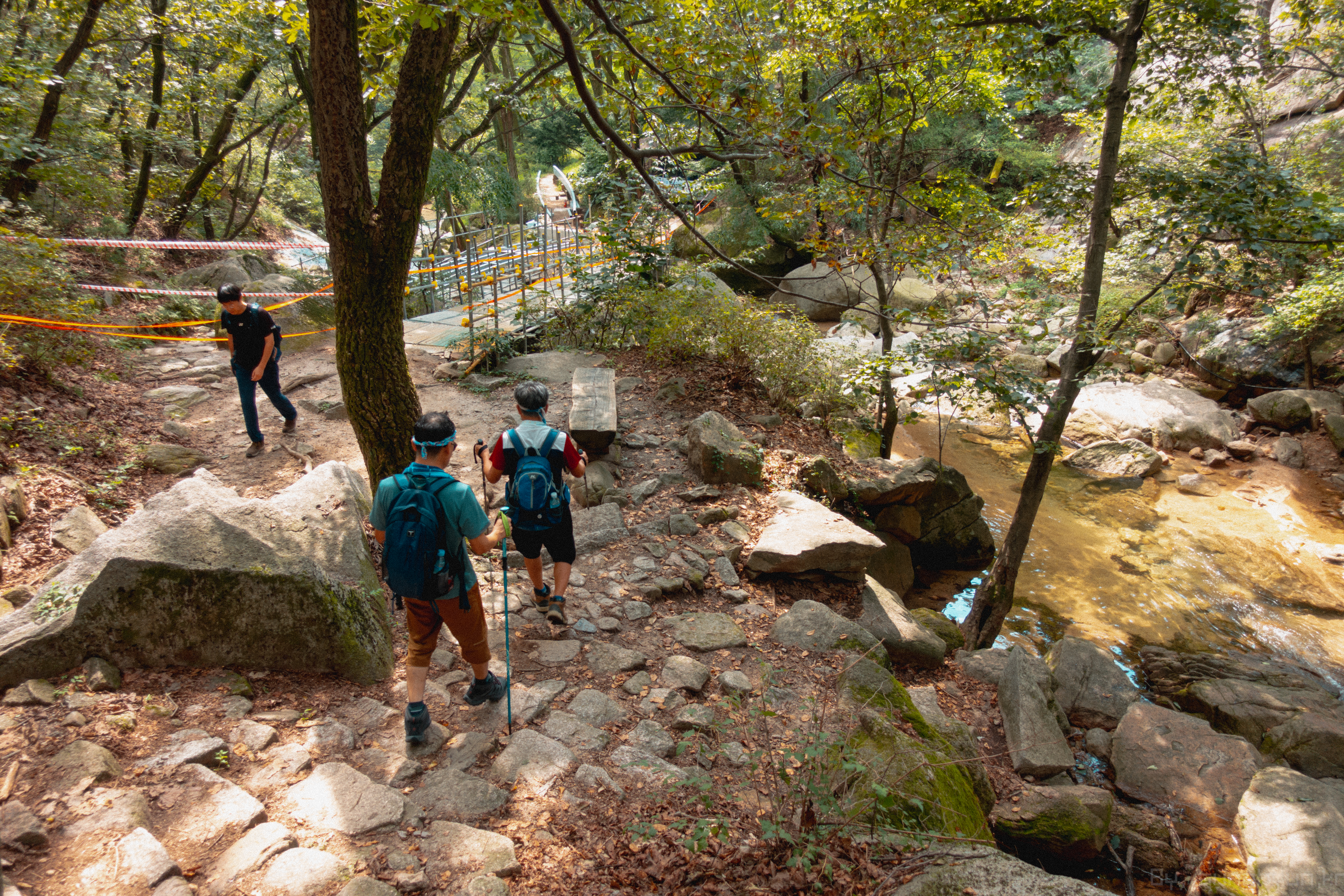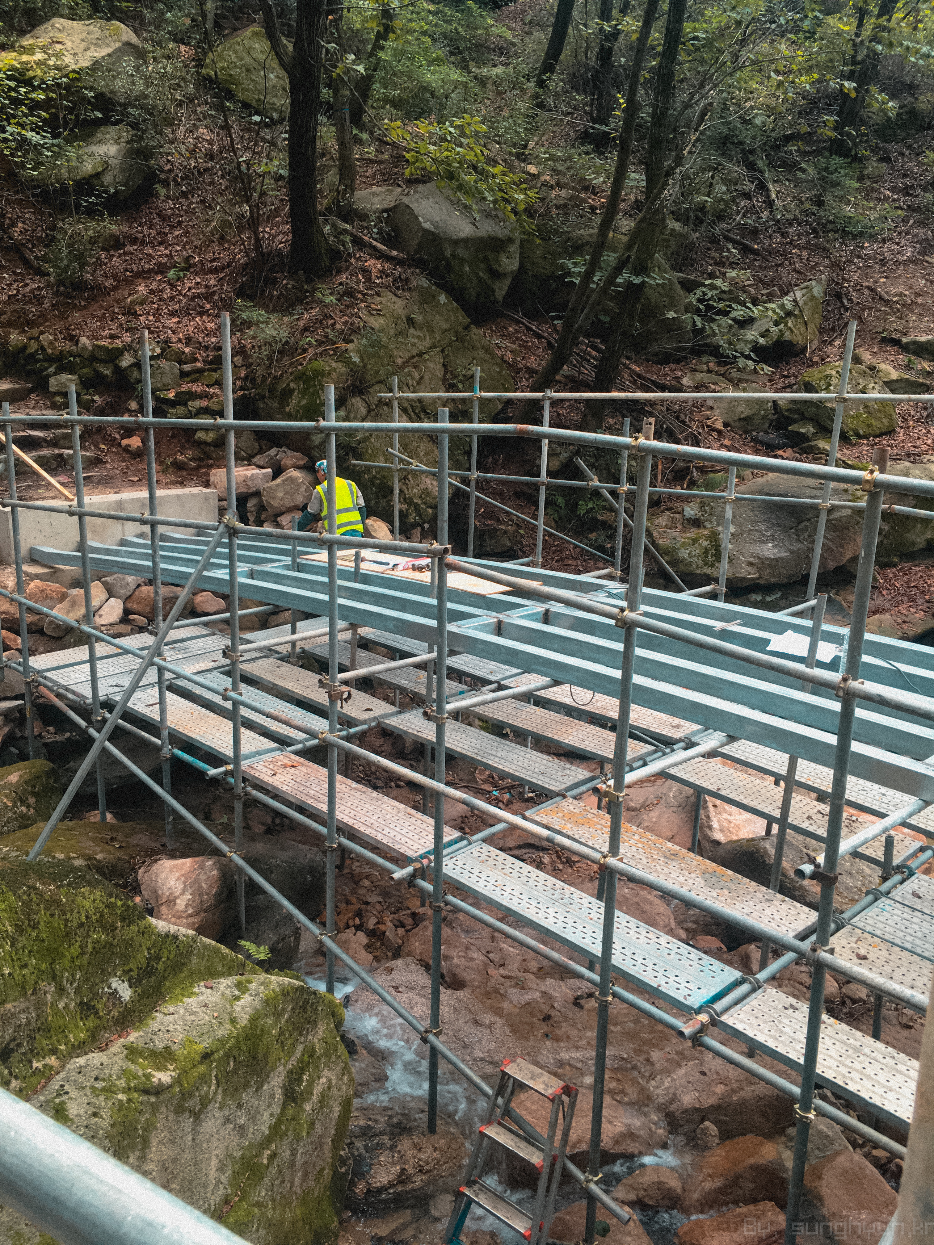 공사하는 모습이다. 등산로 2곳 정도 계곡물이 지나간다.
