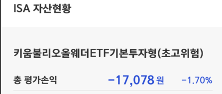 2020년 가입 했는데, 지금 수익이 -1.70%다. 아무리 올웨더라지만.... 연금저축펀드도 불리오 자문투자로 운용하다 전액 해지하고 직접 투자로 변경 했었다.