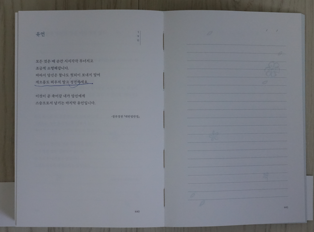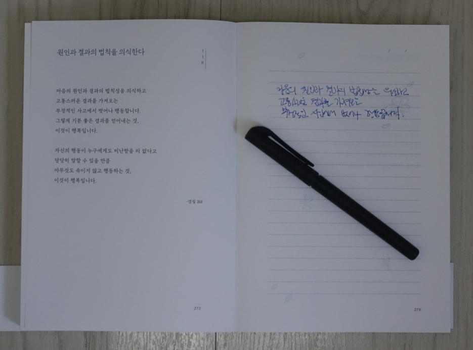 책 자체에 필사를 하는 컨셉이기 때문에 펼쳤을 때 좌·우로 전부 펴지는 제본이다. 상당히 마음에 든다.