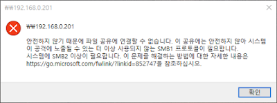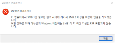 이 컴퓨터에서 SMB 1만 필요한 원격 서버에 레거시 SMB 2 이상을 이용해 연결을 시도했습니다. 보안 강화를 위해 대부분의 windows 버전에는 SMB1이 더 이상 기본값으로 포함되지 않습니다.