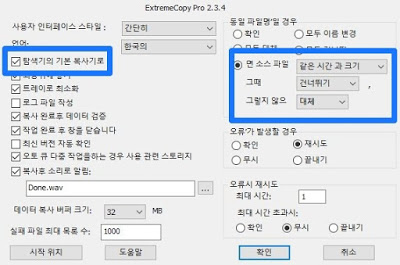 ExtremeCopy Pro의 환경설정 메뉴... 위 파란 부분이 상당히 맘에 드는 기능입니다.