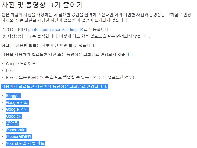 그런데 이 링크를 보면 블로거에서 원본 사진을 업로드해도 자동으로 고화질(저장공간 차지 안함)로 변경된다고 안내되고 있습니다.