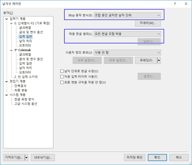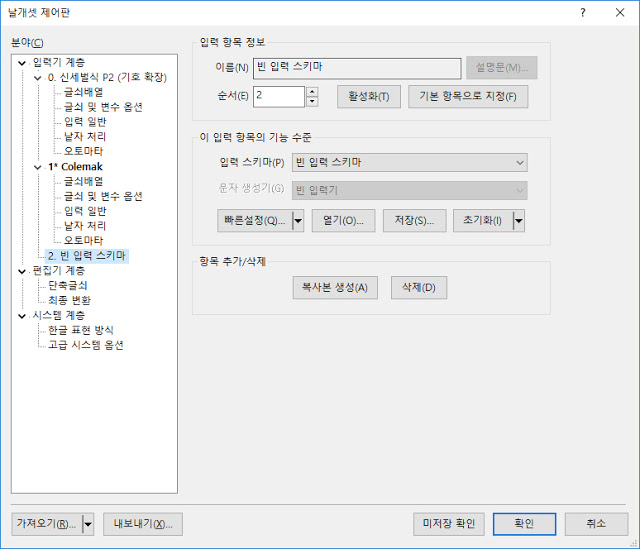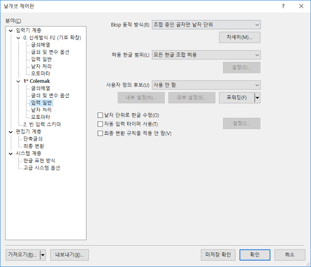 날개셋입력기에서 신세벌식 P2 + 콜맥 자판 설정하는 방법