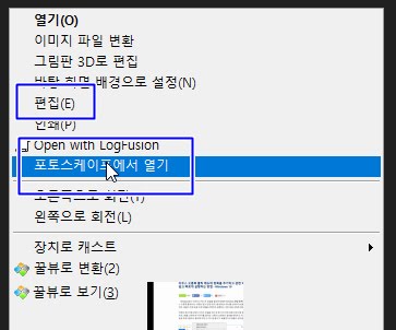 바탕화면이나 특정 이미지나 사진에서 우클릭하면 이런 창이 뜬다. '편집'을 누르면 그림판이 뜨는데 '포토스케이프에서 열기'를 추가하고자 할 때 아래 처럼 하면 된다.