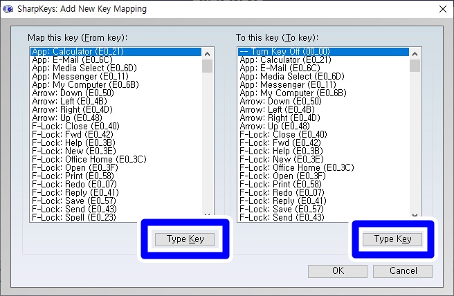 Add를 누르면 이런 화면이 뜨는데 Type key 를 누른 후 원한는 키를 누르면 인식한다.