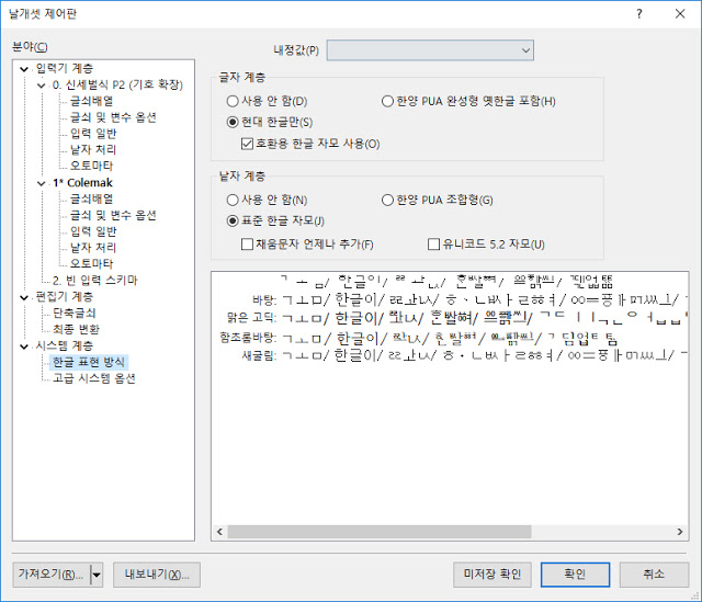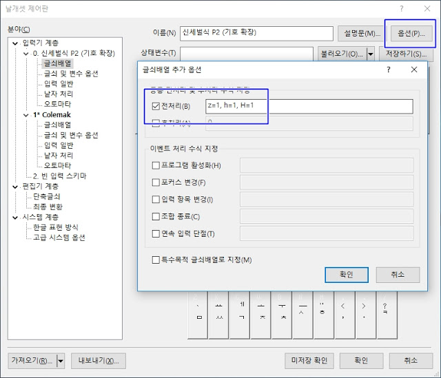날개셋입력기에서 신세벌식 P2 + 콜맥 자판 설정하는 방법