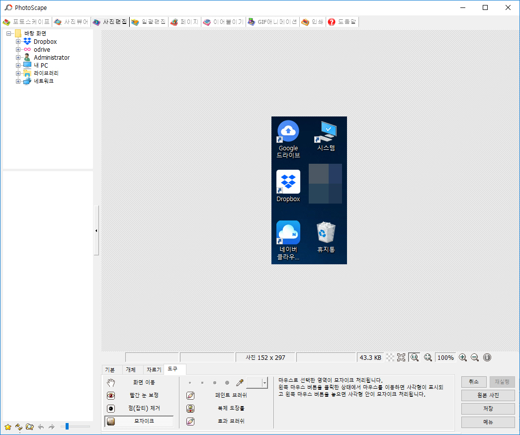 포토스케이프가 실행된 모습... 간단하게 특정 아이콘을 '모자이크' 기능으로 가려본 모습입니다.