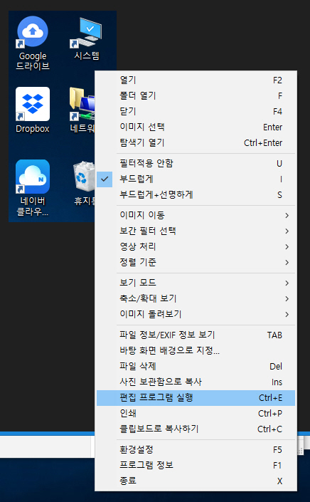 원하는 이미지를 클릭하면 꿀뷰가 뜰 것입니다. 이 상태에서 우클릭을 하면 '편집 프로그램 실행' 이 보일 것인데 이것을 클릭 했을 때 아래의 포토스케이프가 실행되어서 간단하게 편집할 수 있게 하는 것입니다.