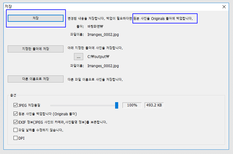 이미지 수정 후 '저장'을 누르면 다시 옵션 창이 뜹니다.