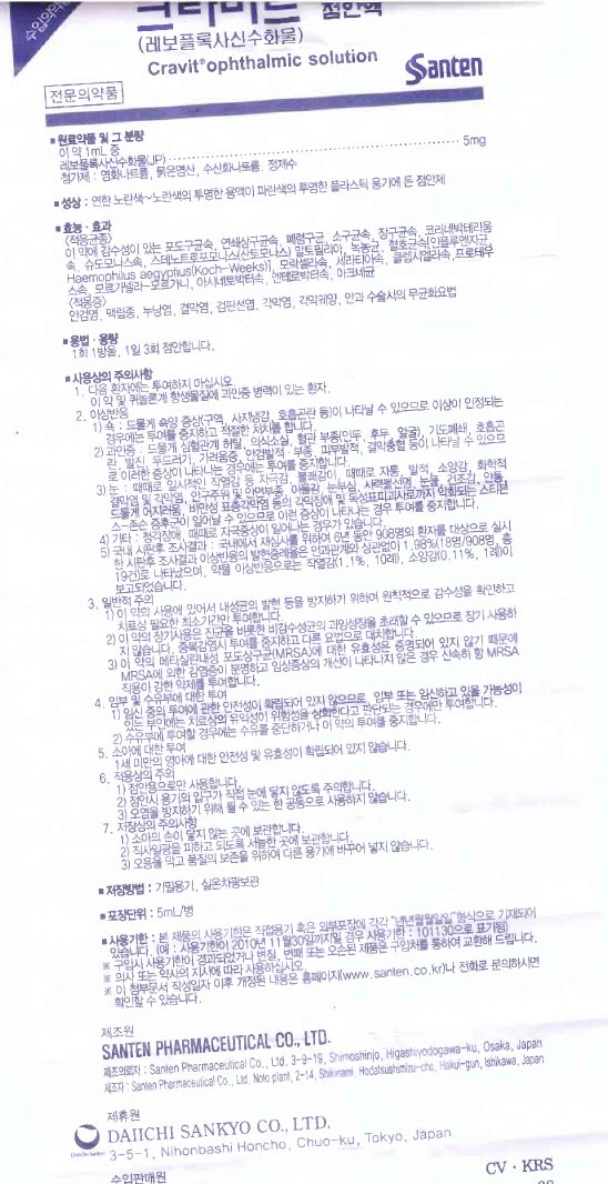 Cravit®ophthalmic solution |전문의약품| $anten ■ft료약» 및 그 분 량 이 약 1ml_ 중 .................................................................................................................................. 5 mg 청가제 : 영화나트름, 묽은영산, 수산화나트륨, 정제수