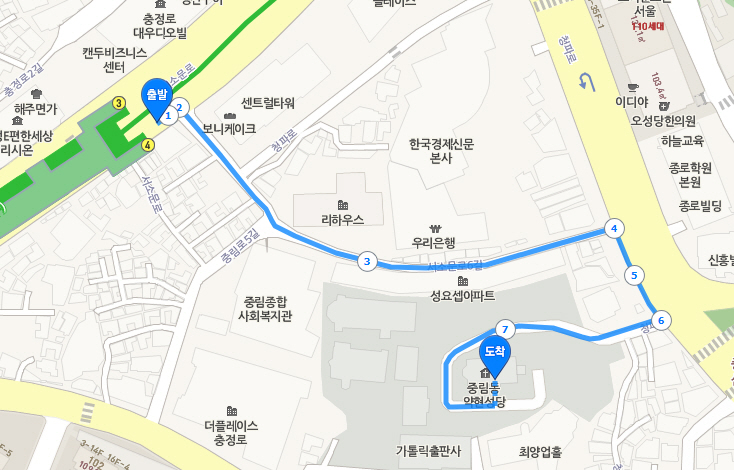 충정로역4번 출구에서 도보로 5분 정도 거리에 있다. 4번 출구 나오자 마자 우측으로 직진하면 대로가 나오고 우회전 후 조금 가다 보면 성당이 언덕위에 보인다.