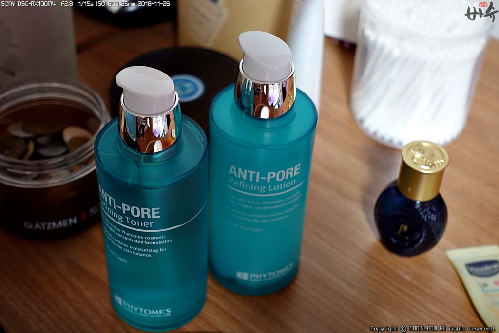 요건 기존에 사용 중인 로션과 함께 찍어본 모습이다. 가격 차이가 많이 나는데 확실히 용기는 안티포어 리파이닝 훨씬 좋다.