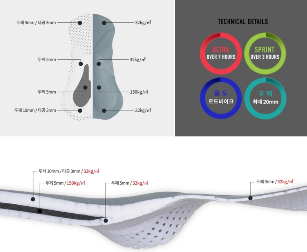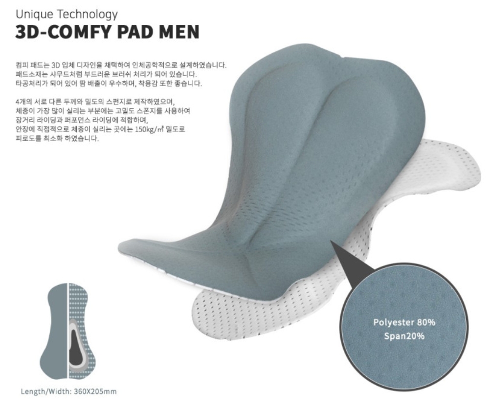 + 엉덩이 패드 부분이 짱짱하고 엠보심 비슷한 처리가 되어 있어 엉덩이와 밀착되어 쓸림이 없다.