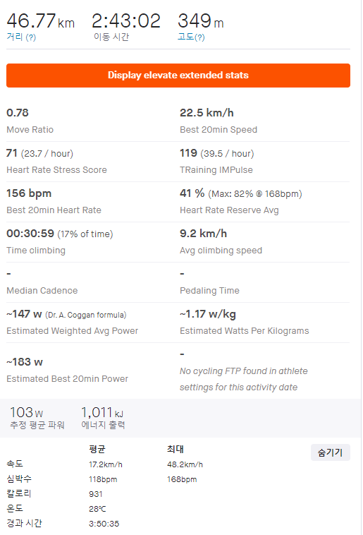 2시간 40분 정도의 라이딩에서 2시간 정도 지나니 피로가 쌓여서 앉아 있기 힘들었다.