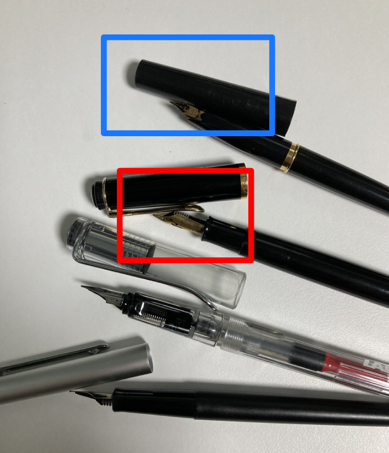 파란색은 세필 , 붉은 색은 펠리칸 두꺼운 펜촉