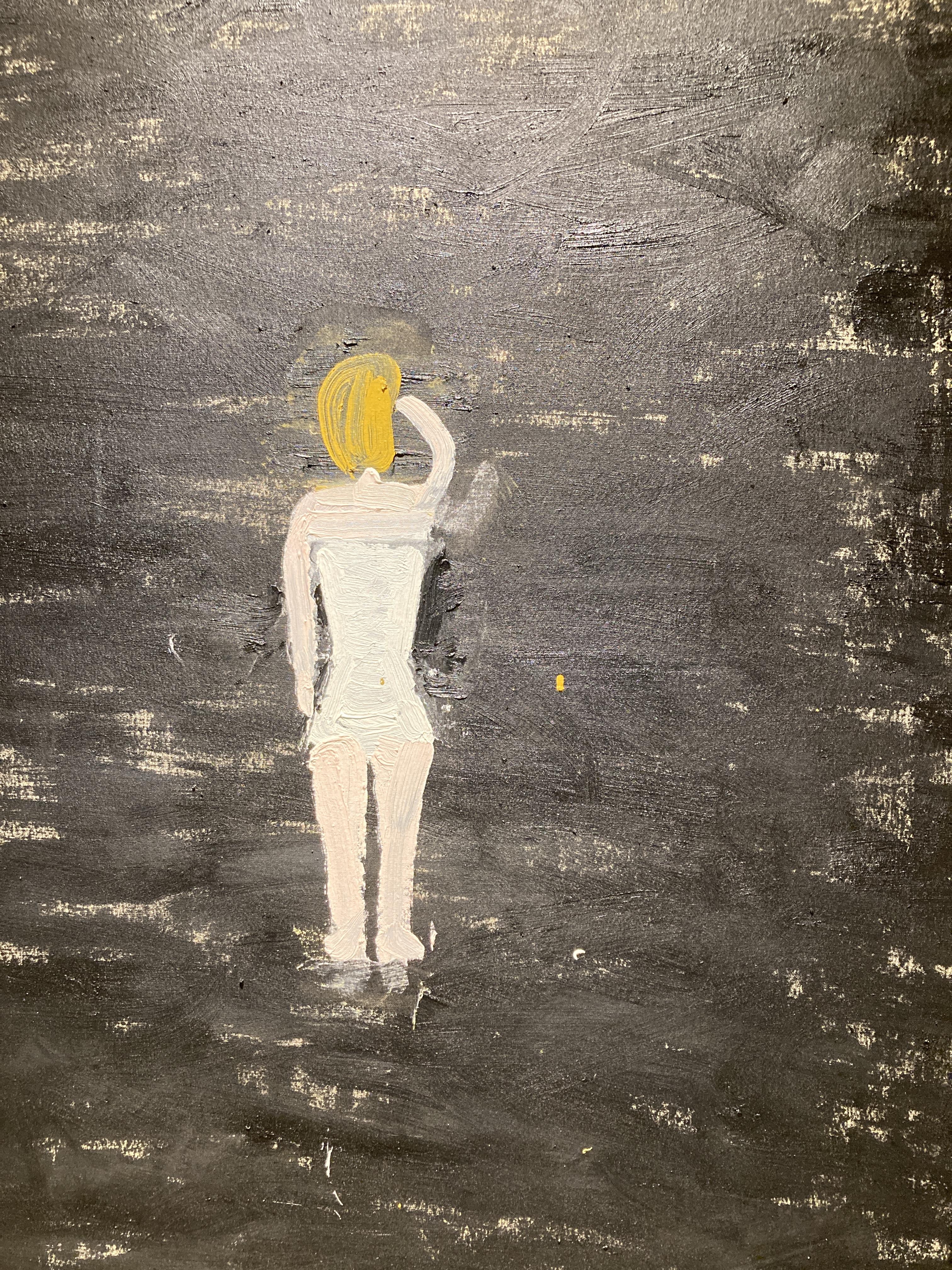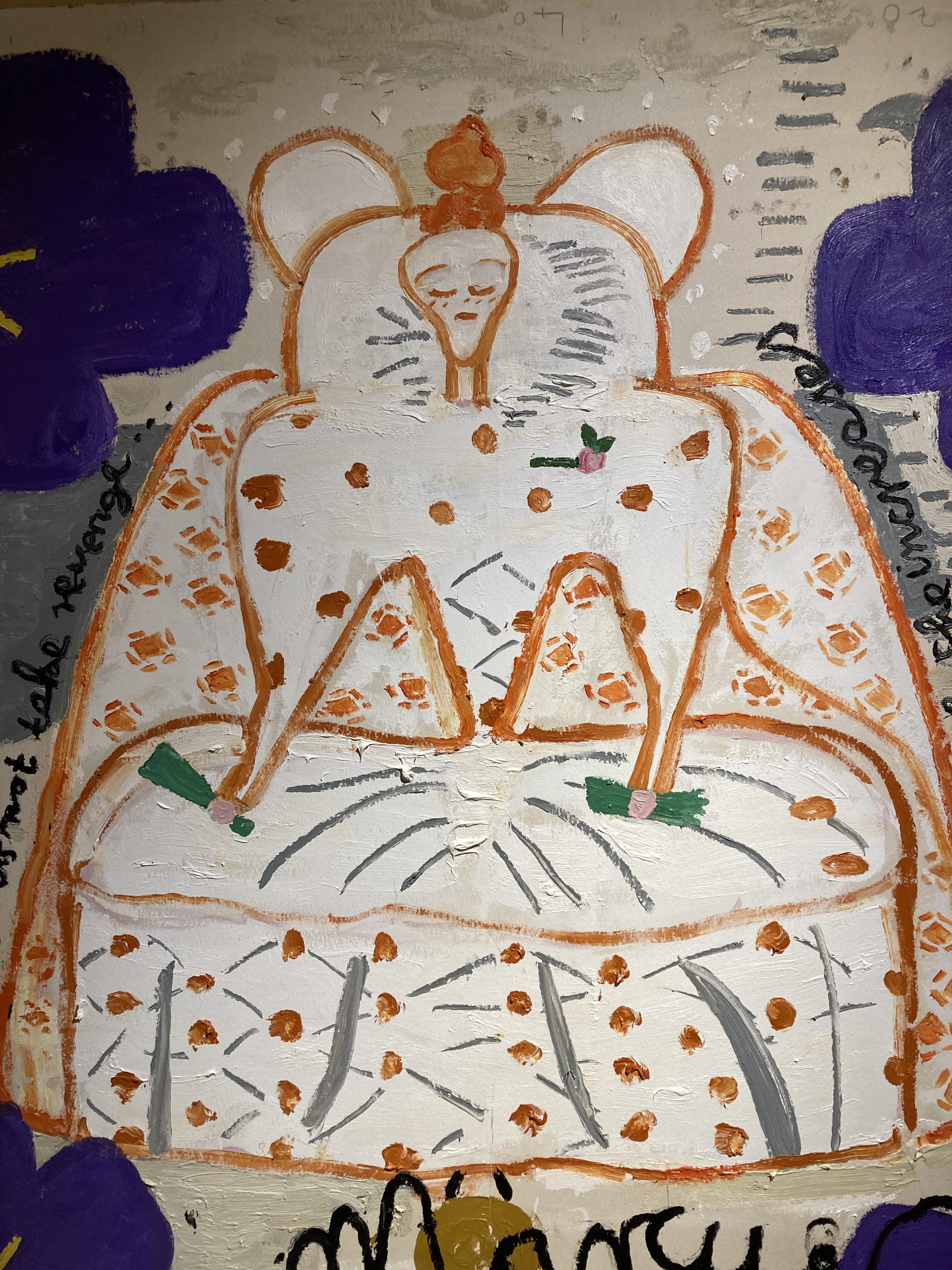 그녀는 프라이밍되지 않은 캔버스에 큰 그림을 만드는 것으로 유명한 예술가입니다.