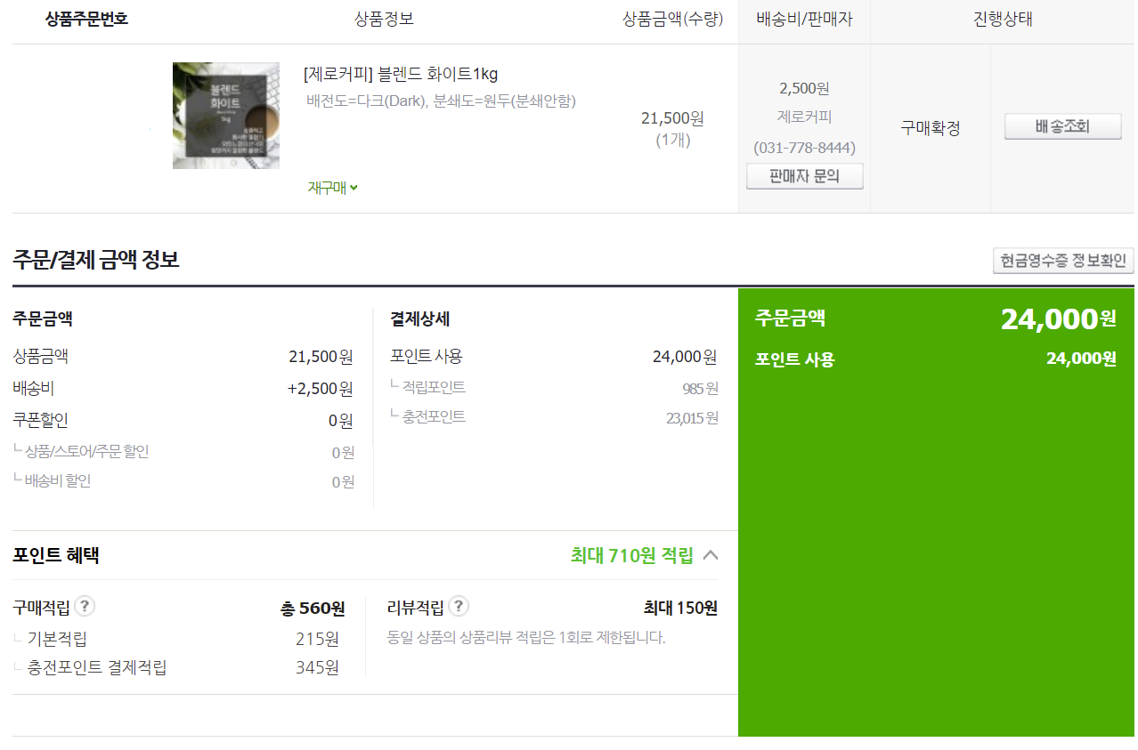 [제로커피] 블렌드 화이트1kg , 원두 구입 후기