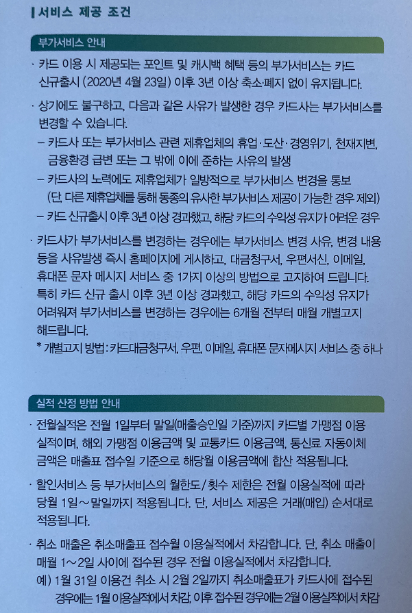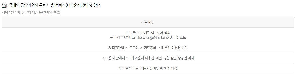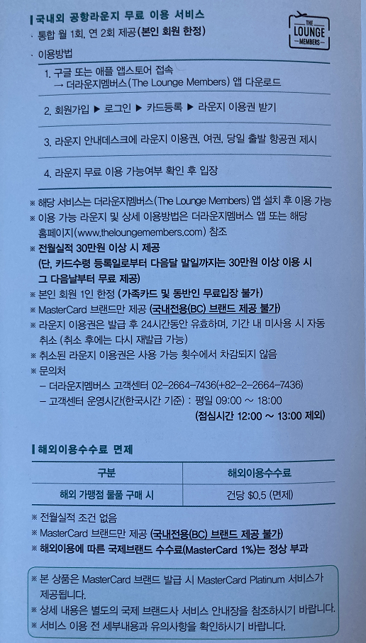 - 국내외 공항라운지 무료 이용 가능(본인만 가능, 전 월 사용 금액 30만원 이상 시)