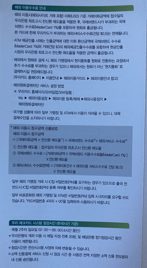 해외에서 사용 시 마스터카드 수수료만 1% 부가 됨, 현금인출은 마스터카드 수수료 + 건당 3달러 부가 됨