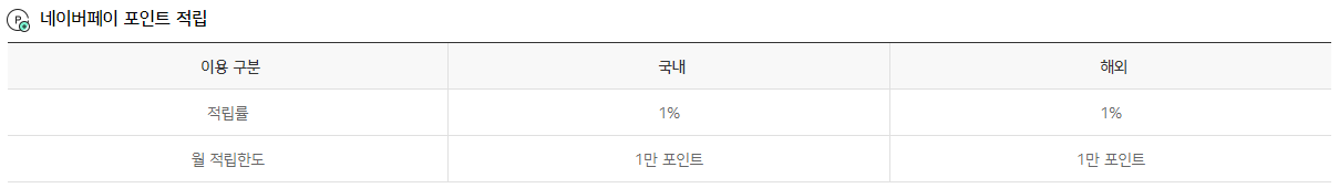 - 국내, 해외 결제의 1% 적립, 월 적립한도 1만 포인트