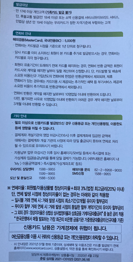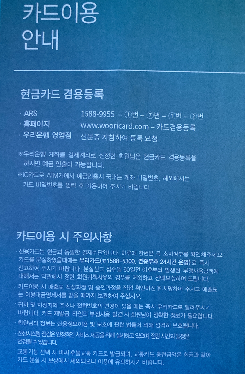 카드 전면에 카드번호가 없어서 좋음(스마트폰 포켓 사용 시 유용 함)