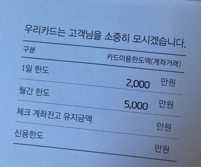 카드 신청 시 한도 조절 가능, 최대로 신청 함