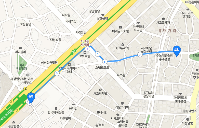 합정역과 홍대입구역 사이에 있음, 합정역 3번 출구가 가까울 듯 함